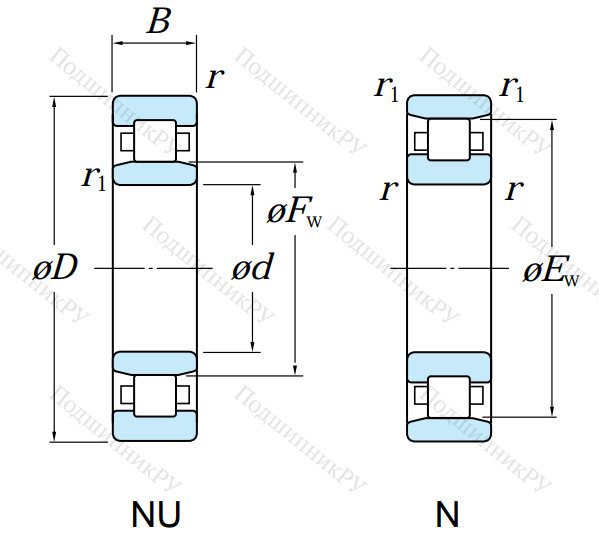 В зависимости от модификации подшипник имеет различную конструкцию: тип N рассмотрен выше, NJ – имеет уширенное внутреннее кольцо, NU – уширенное внешнее;